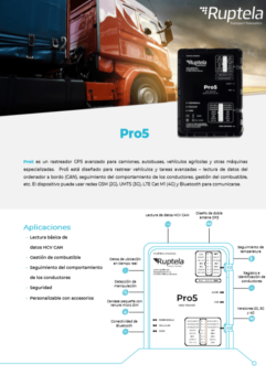 Pro5 es un rastreador GPS avanzado para camiones, autobuses, vehículos agrícolas y otras máquinas especializadas. Pro5 está diseñado para rastrear vehículos y tareas avanzadas – lectura de datos del ordenador a bordo (CAN), seguimiento del comportamiento de los conductores, gestión del combustible, etc. El dispositivo puede usar redes GSM (2G), UMTS (3G), LTE Cat M1 (4G) y Bluetooth para comunicarse.